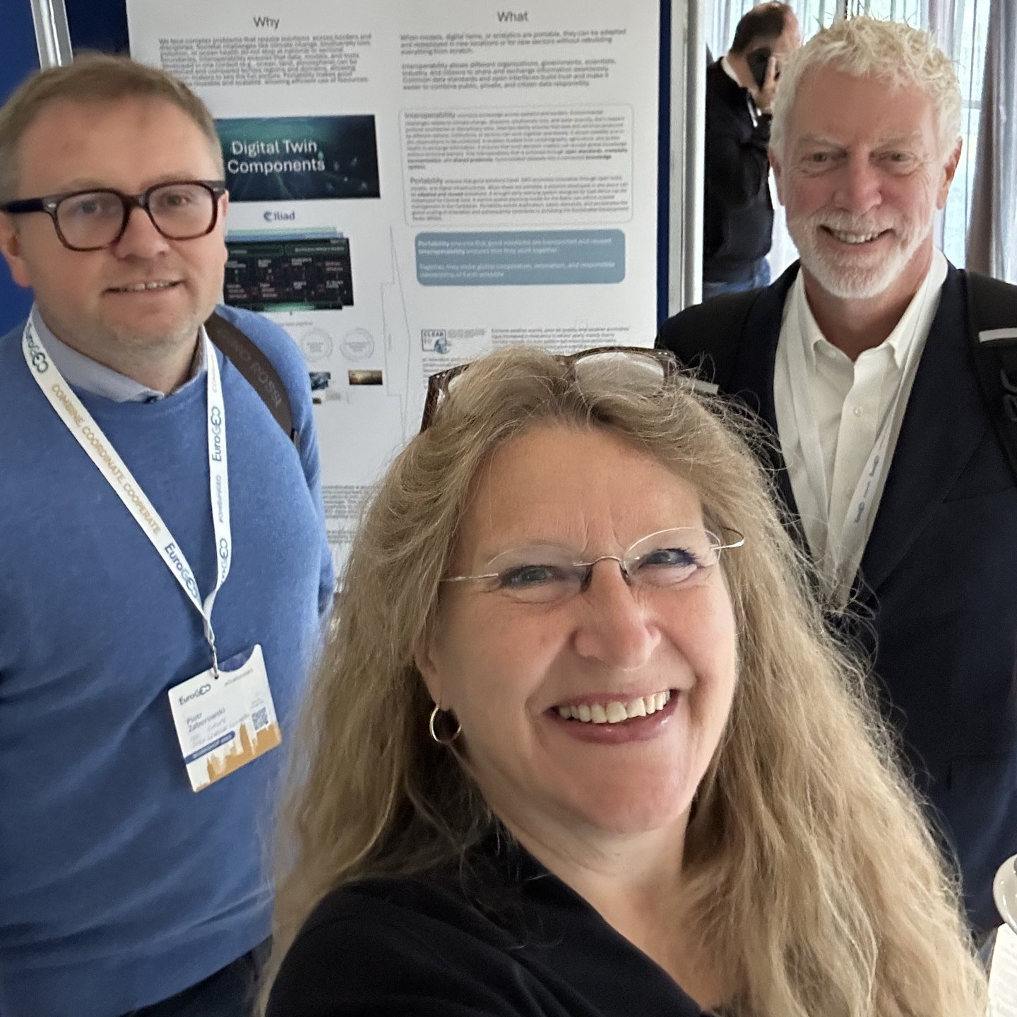 Both open standards and data spaces are key elements of the CLEAR-EO solutions. Bente Lilja Bye is here in front of the poster together with Piotr Zaborowski, OGC (left) and Mark Dietrich, SAGE project (right).