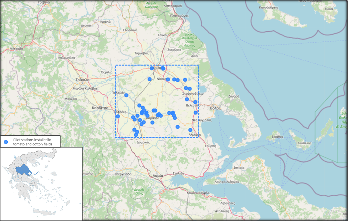 The pilot is conducted in Thessaly (central Greece), leveraging ~45 in-field stations operated by Neuropublic, across tomato and cotton fields. This network underpins calibration, validation, and the co-definition of alert thresholds and specifications with local agronomists and farmers.
